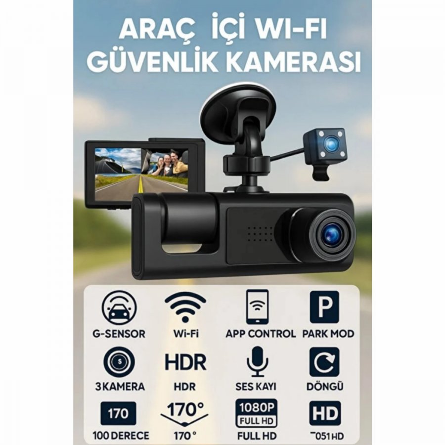ARAÇ İÇ VE DIŞ 3 KAMERA 1080P SÜPER HD WİFİ 2İNÇ LCD EKRAN GECE GÖRÜŞ-G-SENSÖR-GERİ GÖRÜŞ CAM001