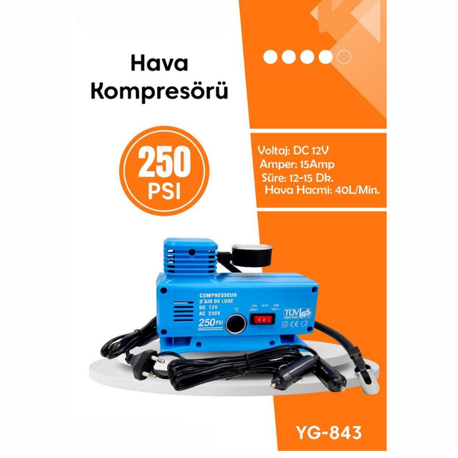 HAVA KOMPRESÖRÜ GÖSTERGELİ AC230V/DC12V 15AMP 250 PSI YG-843