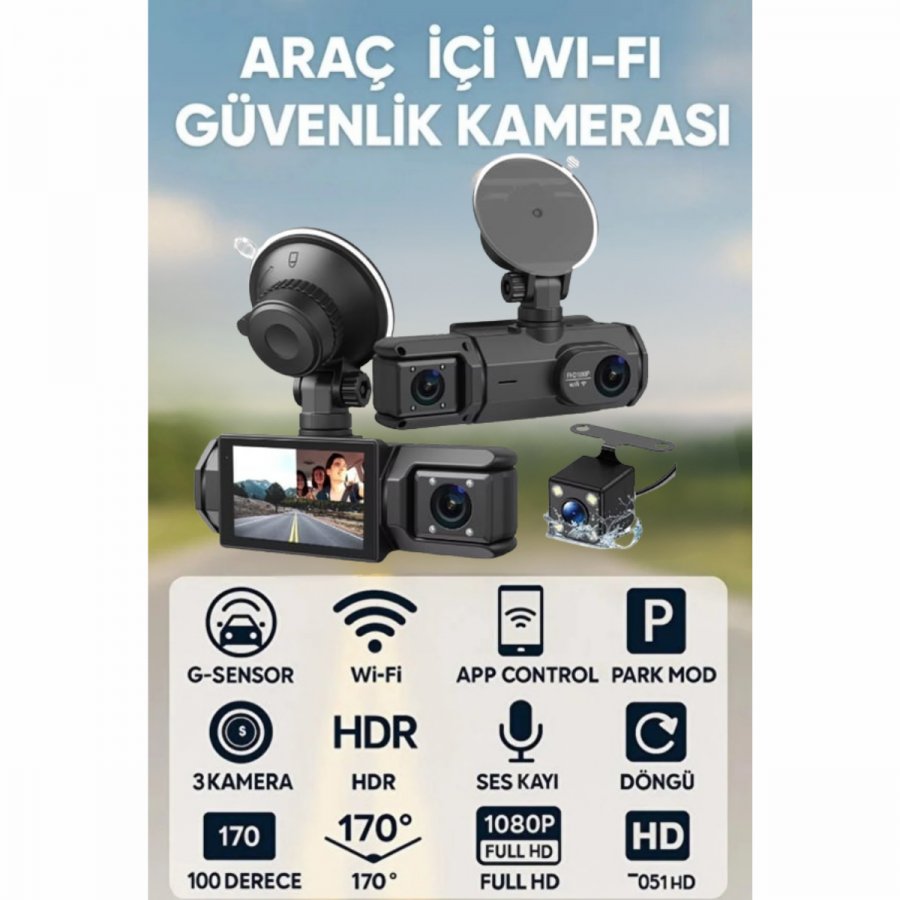 ARAÇ İÇ VE DIŞ 3 KAMERA 1080P SÜPER HD WİFİ 2İNÇ LCD EKRAN GECE GÖRÜŞ-G-SENSÖR-GERİ GÖRÜŞ CAM001