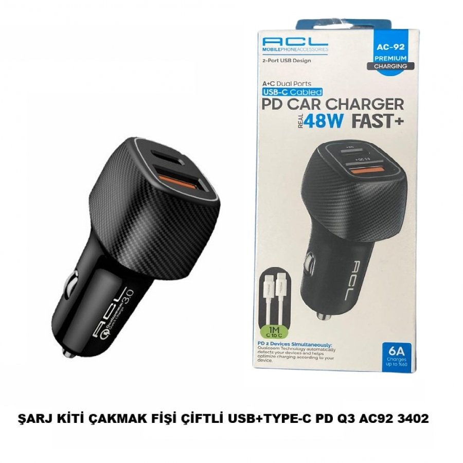 ŞARJ KİTİ ÇAKMAK FİŞİ ÇİFTLİ USB+TYPE-C PD Q3 AC92 3402